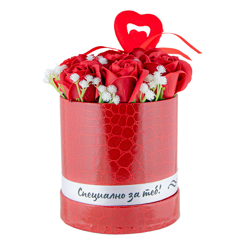 - Емоционално послание: подредени декоративни рози, бели акценти и романтично сърце с панделка — детайли, които превръщат подаръка в ясно и въздействащо послание за специален повод.