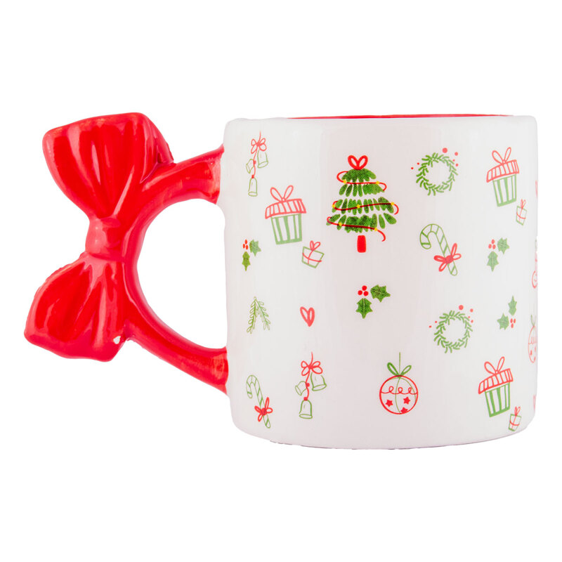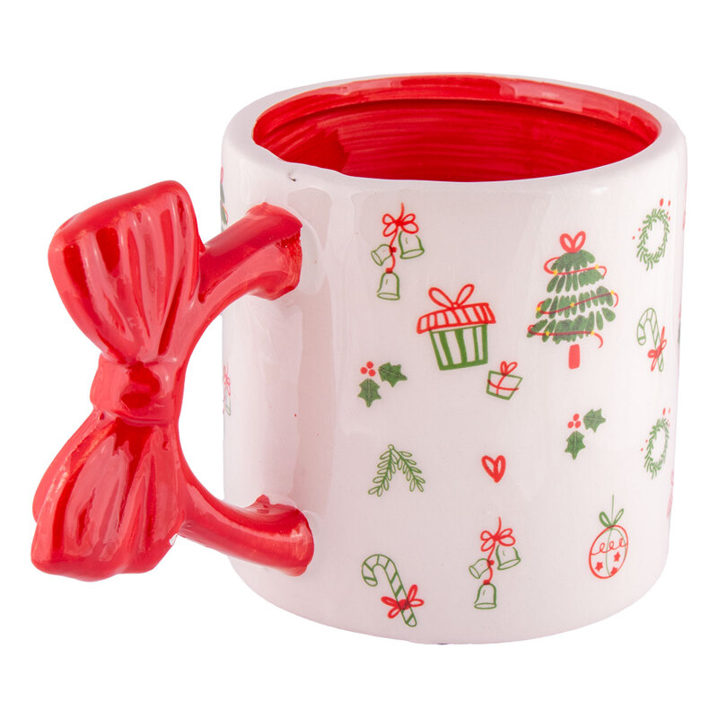 - Бял фон със зелено-червени коледни символи и червена 3D дръжка – панделка