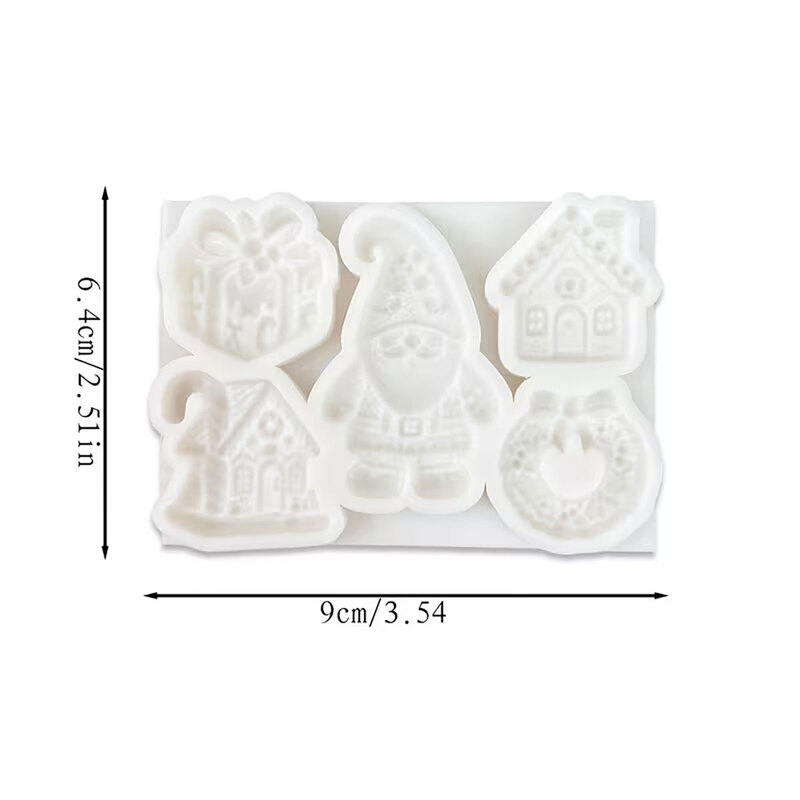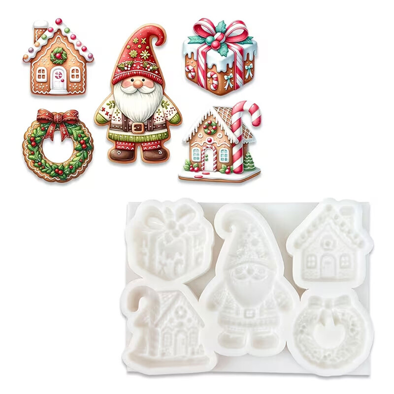 - 5 различни форми в един молд – джинджифилов гном, две сладки къщички, подарък с панделка и коледен венец.